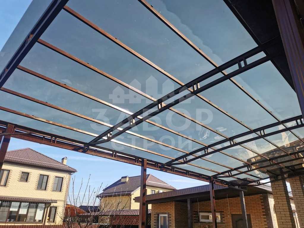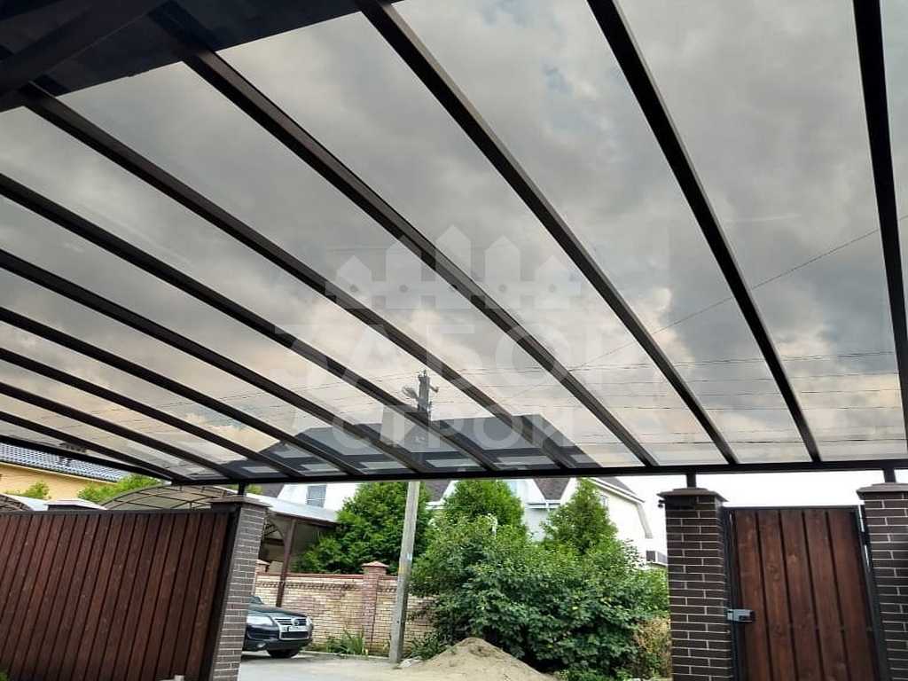 Поэтому компания "НавесСтрой" настоятельно рекомендует не экономить, а усилить каркас навеса из монолитного поликарбоната более жёсткими профилями с увеличенной толщиной металла и количеством несущих ферм.